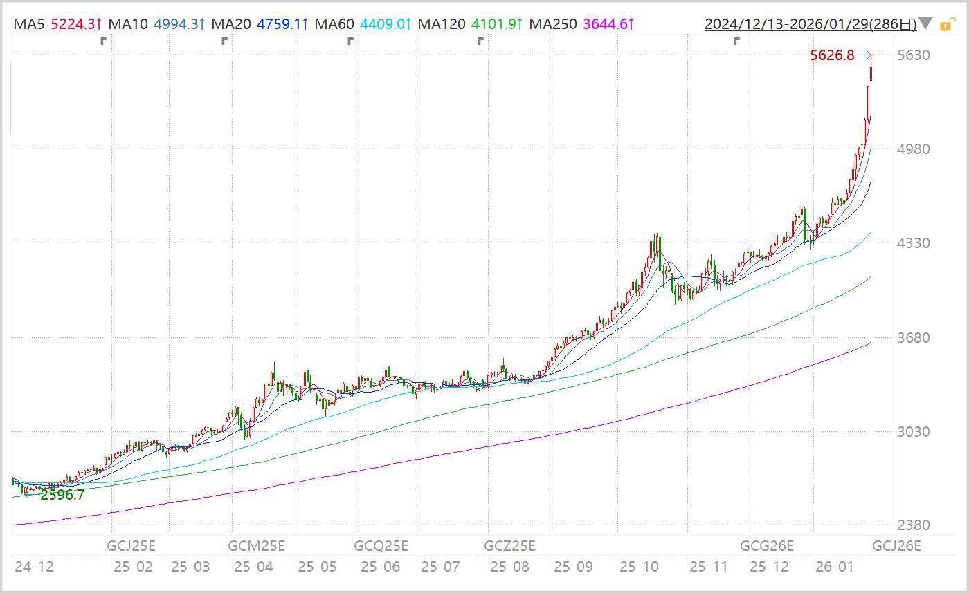 当前,COMEX黄金主力期货一度突破5600美元,但从更长期视角看,这轮超级周期或未到终结的时候。