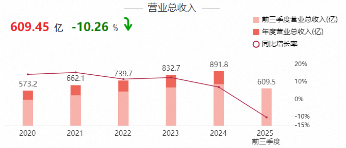 尽管板块情绪高涨,五粮液的业绩表现仍需理性审视。2025年前三季度财报显示,公司实现营业总收入609.45亿元,同比下降10.26%;