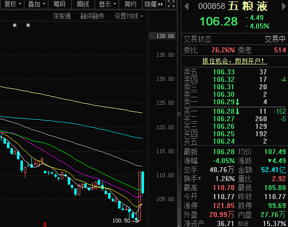 2026年1月29日,A股白酒板块迎来罕见涨停潮。五粮液(000858.SZ)以单日10%的涨幅强势封板,股价收于110.77元,成交额突破104.51亿元,创近一个月新高。同日,贵州茅台大涨8.61%重回1400元关口,泸州老窖、山西汾酒等19只白酒股集体涨停,板块人气位居市场前列。