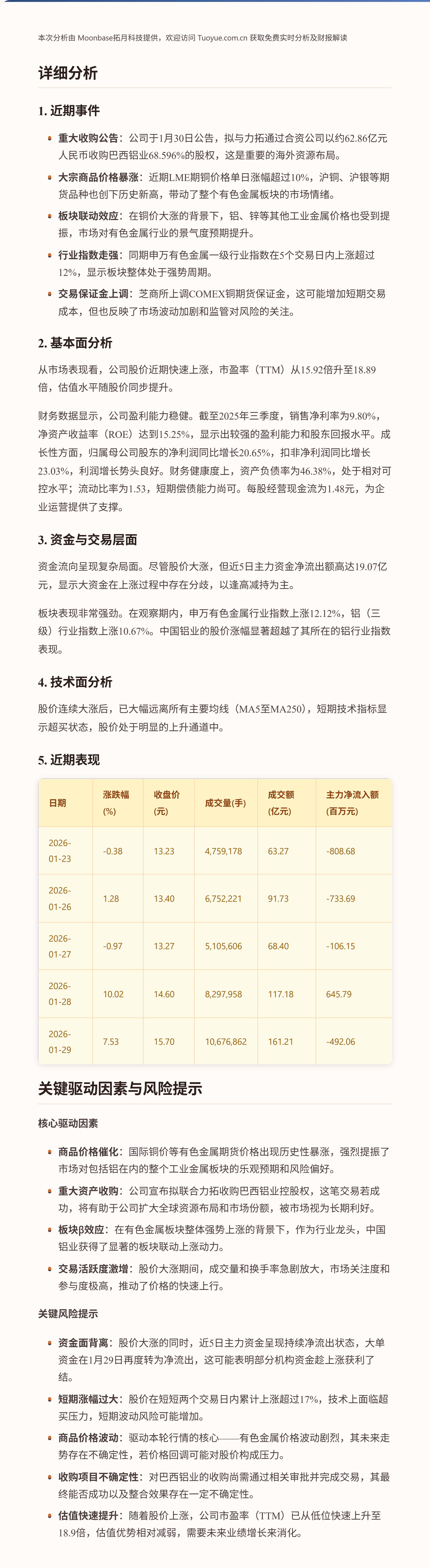 $中国铝业(SH601600)$ 中国铝业股价在最近两个交易日出现显著上涨,累计涨幅超过17%。这主要受到国际铜价等有色金属价格飙升的带动,以及公司宣布拟与力拓合资收购巴西铝业多数股权的重大海外扩张消息影响。关键亮点在于公司股价表现强于所属的铝行业指数,显示出较强的市场关注度。【欢迎点赞关注反馈!主页有更多精彩解读和分析哦~】