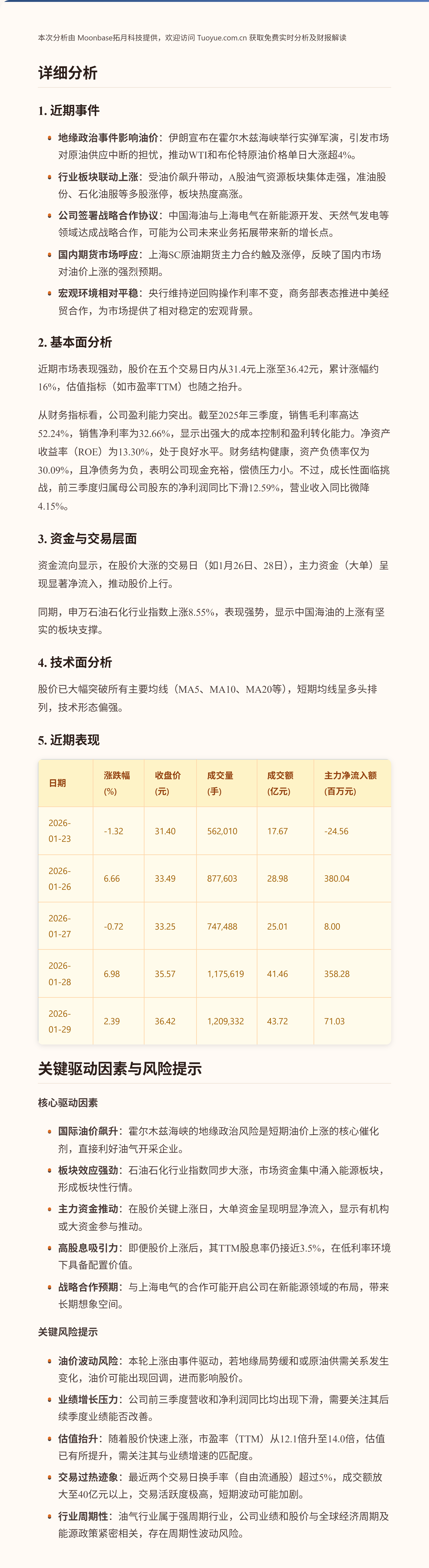 $中国海油(SH600938)$ 中国海油股价在最近五个交易日内呈现显著上涨,主要受到地缘政治紧张局势推高国际油价,以及公司与上海电气签署战略合作协议的积极影响。关键亮点包括股价连续拉升、成交量与换手率同步放大,以及公司保持了较高的股息率和稳健的财务结构。【欢迎点赞关注反馈!主页有更多精彩解读和分析哦~】