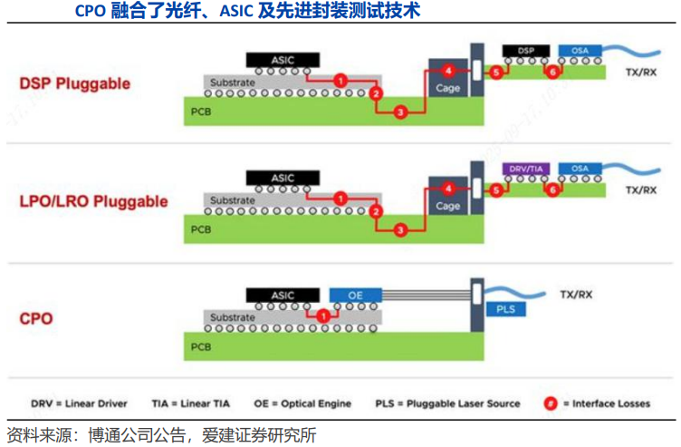 CPO(共封装光学)是一种新型光电子集成技术,其核心是将网络交换芯片与光模块共同封装于同一个插槽内,直接实现二者的紧密集成。通过大幅缩短交换芯片与光引擎之间的物理距离,使得该设计相较传统热插拔模块与LPO(线性可插拔光模块)技术不仅能显著提高电信号在芯片与光引擎间的传输速度,还能减少信号传输过程中的损耗,进而优化数据交互效率。