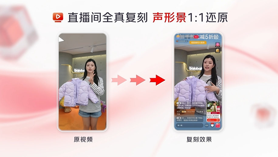 尤为值得关注的是,京东在此次年货节上线的“数字人直播间复刻”功能,又进一步降低了商家的应用门槛。商家仅需上传一段真人直播素材,即可精准复刻主播形象、声线神态与直播间布景,更支持90度以上转身、持品、面部遮挡等大姿态复刻,动作流畅无违和。这一功能让每一场优质真人直播内容都能转化为可重复变现的数字资产,实现“一次创作、多次复用”,大幅提升了直播内容的商业价值,也是推动新一轮产业增长浪潮到来的关键技术。