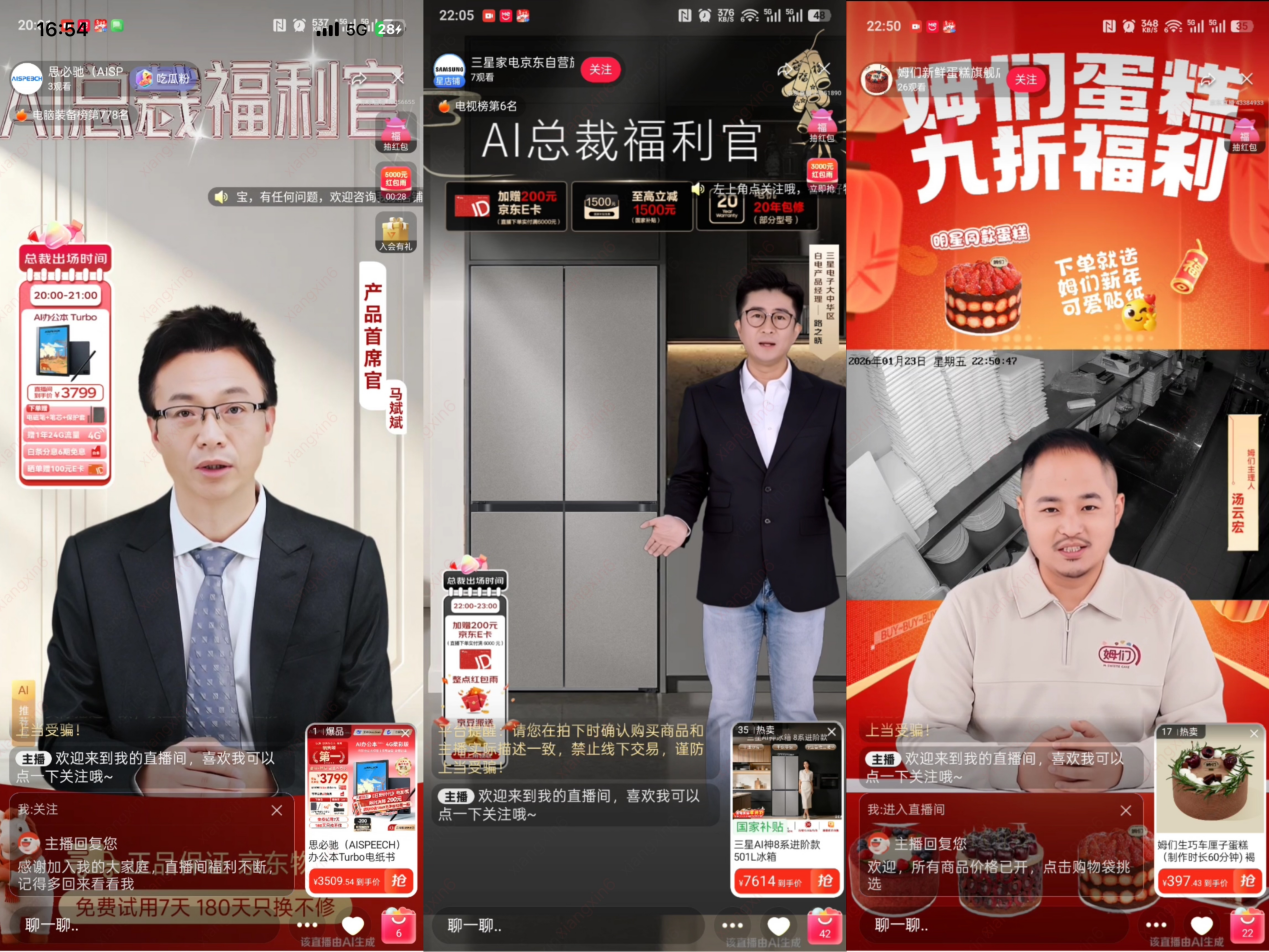 在这一轮产业增长浪潮中,最直观的改变就是直播场景从单纯的“卖货场”向“沉浸式体验场”的升级。在京东2026年年货节期间,超百位知名品牌总裁以数字人分身集体空降直播间,品牌覆盖家电、3C、商超、健康等多个热门品类。数字人总裁不仅精准复刻真人形象与声线,更能实时讲解产品卖点、发放专属福利,直接开启品牌带货的全新可能。