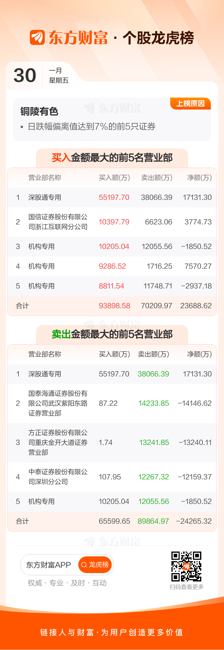 交易所2026年1月30日公布的交易公开信息显示,铜陵有色因成为日跌幅偏离值达到7%的前5只证券上榜。铜陵有色当日收报8.27元,涨跌幅-10.01%,偏离值-9.22%,换手率8.79%,成交额83.68亿。