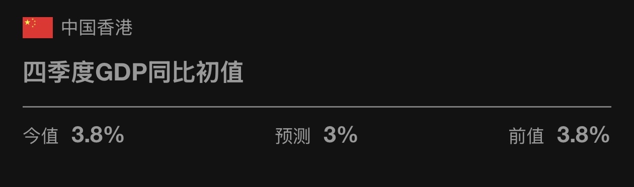 中国香港2025年全年GDP增速3.5%,预期3.20%,前值2.50%。其中,第四季度GDP年率终值3.8%,预期3.00%,前值3.80%;季率终值1%,预期0.40%,前值0.70%。