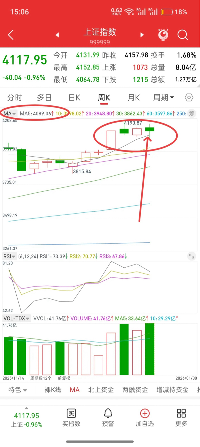 为什么说4080重要,因为这个位置是前顶平台支撑,如果收盘跌破了,行情就走弱了,同时也就意味着大盘五周均线支撑(目前4089)跌破。