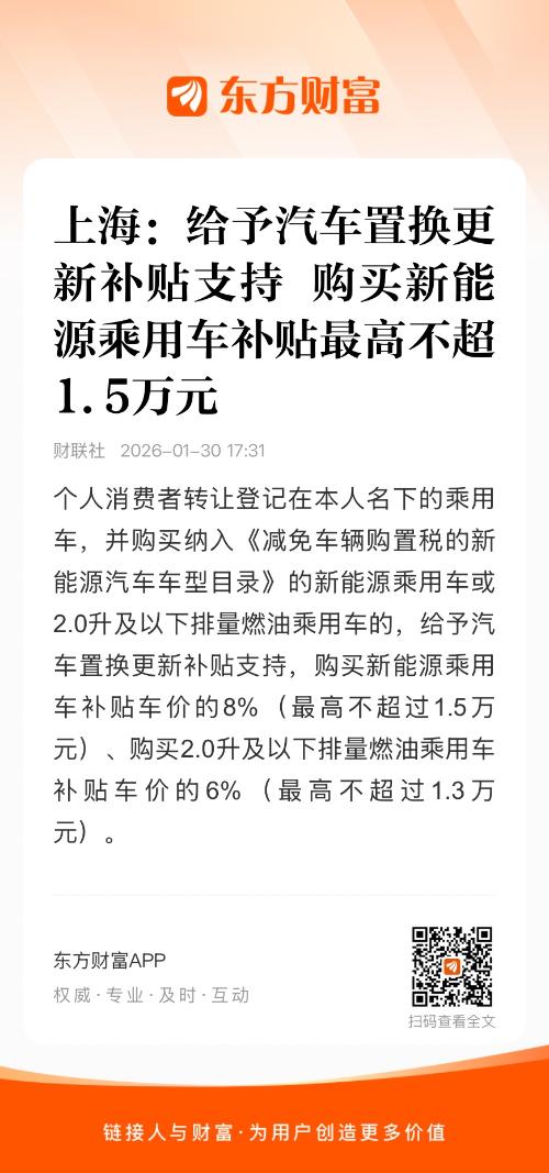 上海市发改委、上海市财政局发布关于上海市贯彻实施2026年大规模设备更新和消费品以旧换新政策的通知。其中提出,支持汽车置换更新。个人消费者转让登记在本人名下的乘用车,并购买纳入《减免车辆购置税的新能源汽车车型目录》的新能源乘用车或2.0升及以下排量燃油乘用车的,给予汽车置换更新补贴支持,购买新能源乘用车补贴车价的8%(最高不超过1.5万元)、购买2.0升及以下排量燃油乘用车补贴车价的6%(最高不超过1.3万元)。