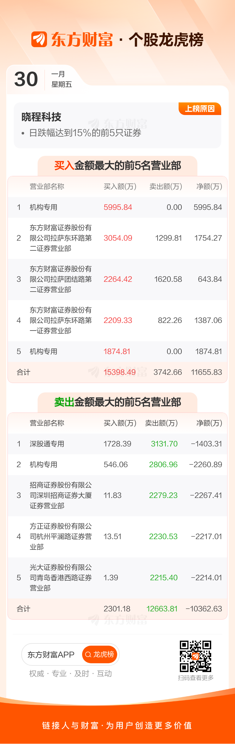 交易所2026年1月30日公布的交易公开信息显示,晓程科技因成为日跌幅达到15%的前5只证券上榜。晓程科技当日收报67.5元,涨跌幅-20.00%,偏离值-20.00%,换手率15.89%,成交额25.78亿。