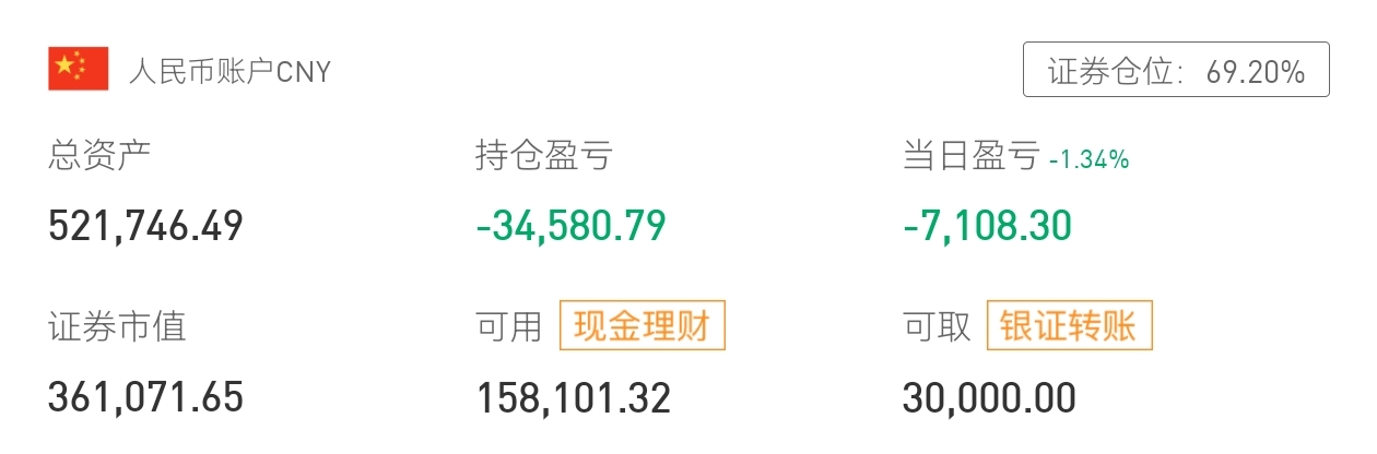 持仓亏损近七万,证券占比近七成,现金理财部分灵活可用,整体资产配置偏激进需谨慎。
