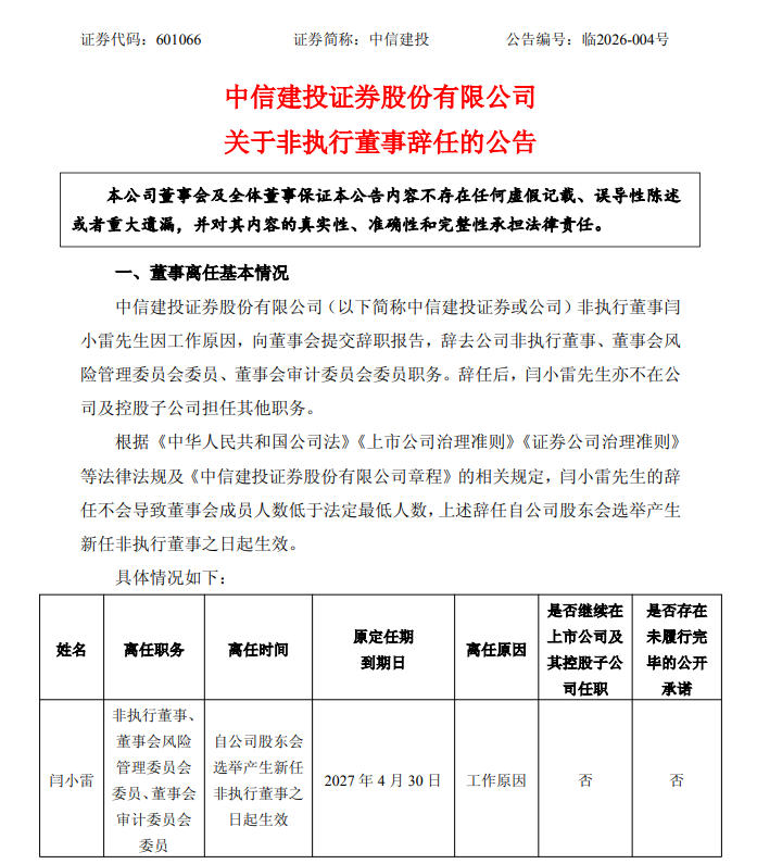 【中信建投:非执行董事闫小雷因工作原因辞职】中信建投1月30日公告,公司非执行董
