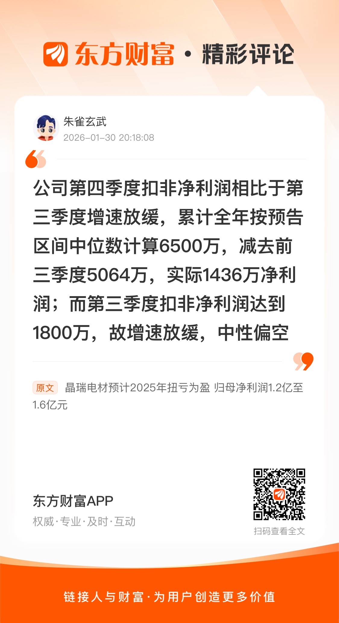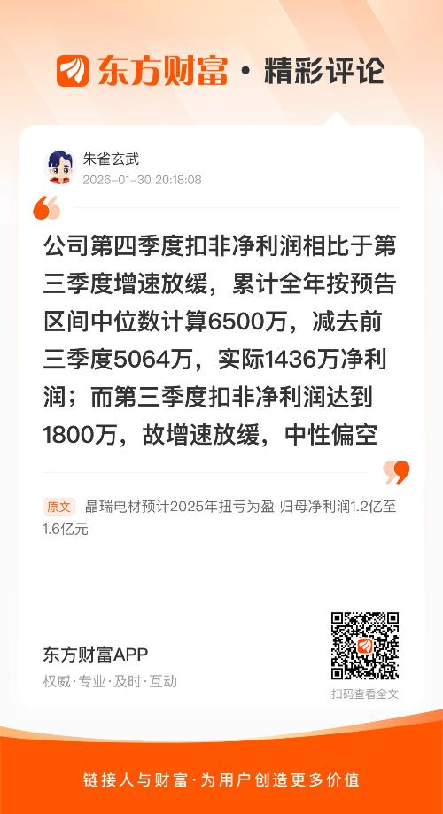 //@朱雀玄武 : 公司第四季度扣非净利润相比于第三季度增速放缓,累计全年按预告区间中位数计算6500万,减去前三季度5064万,实际1436万净利润;而第三季度扣非净利润达到1800万,故增速放缓,中性偏空