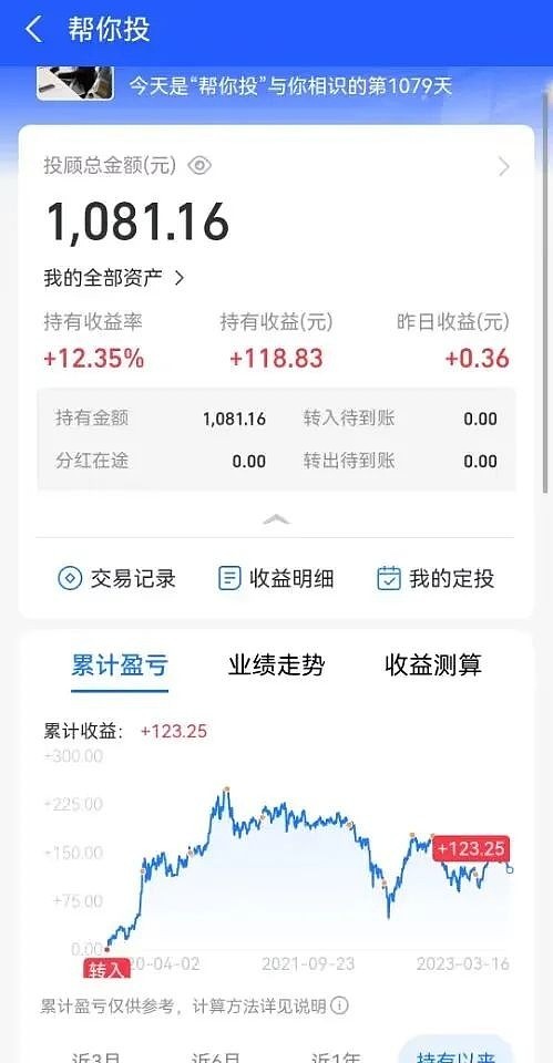 帮你投是先锋领航和蚂蚁合作开发的一款基金投顾产品,2020年4月初上线。为了观察学习这家世界最大的投资公司是如何买基金的,帮你投一上线,我就建立一了个1000元的观察仓。现在马上满3年,期间我一直持有未动,收益情况如下: