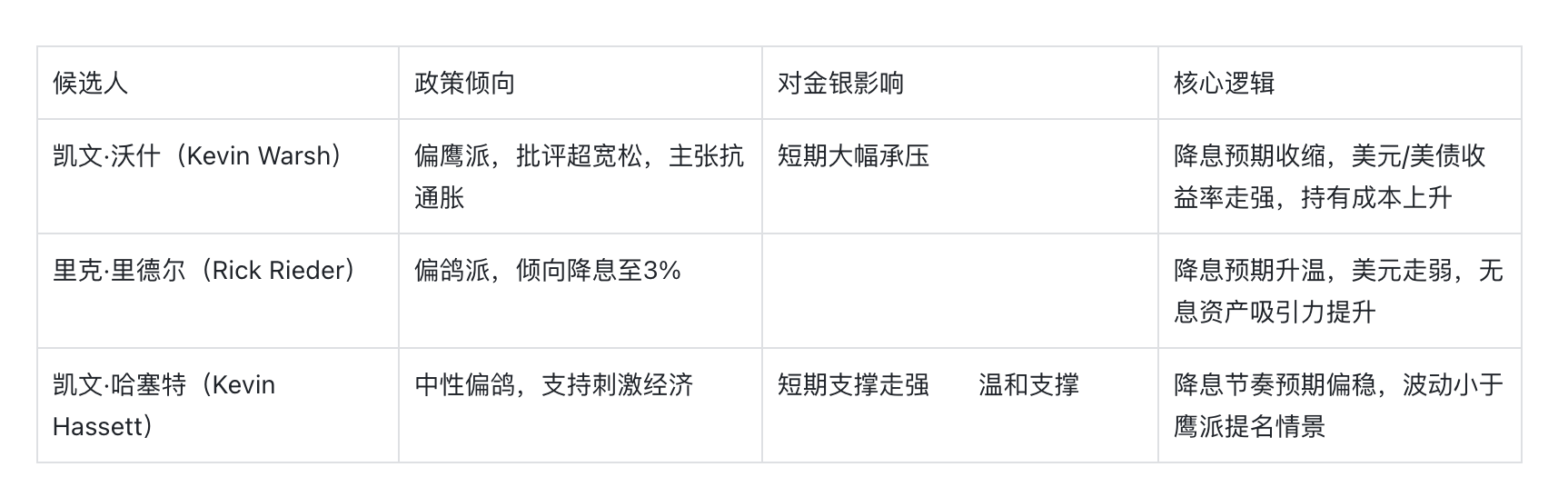 沃什长期批评超宽松政策,被视为“鹰派”,市场预判其上任后会放慢降息节奏、维持高利率更久。如果是他上台,那么黄金白银可能会有更大的跌幅。