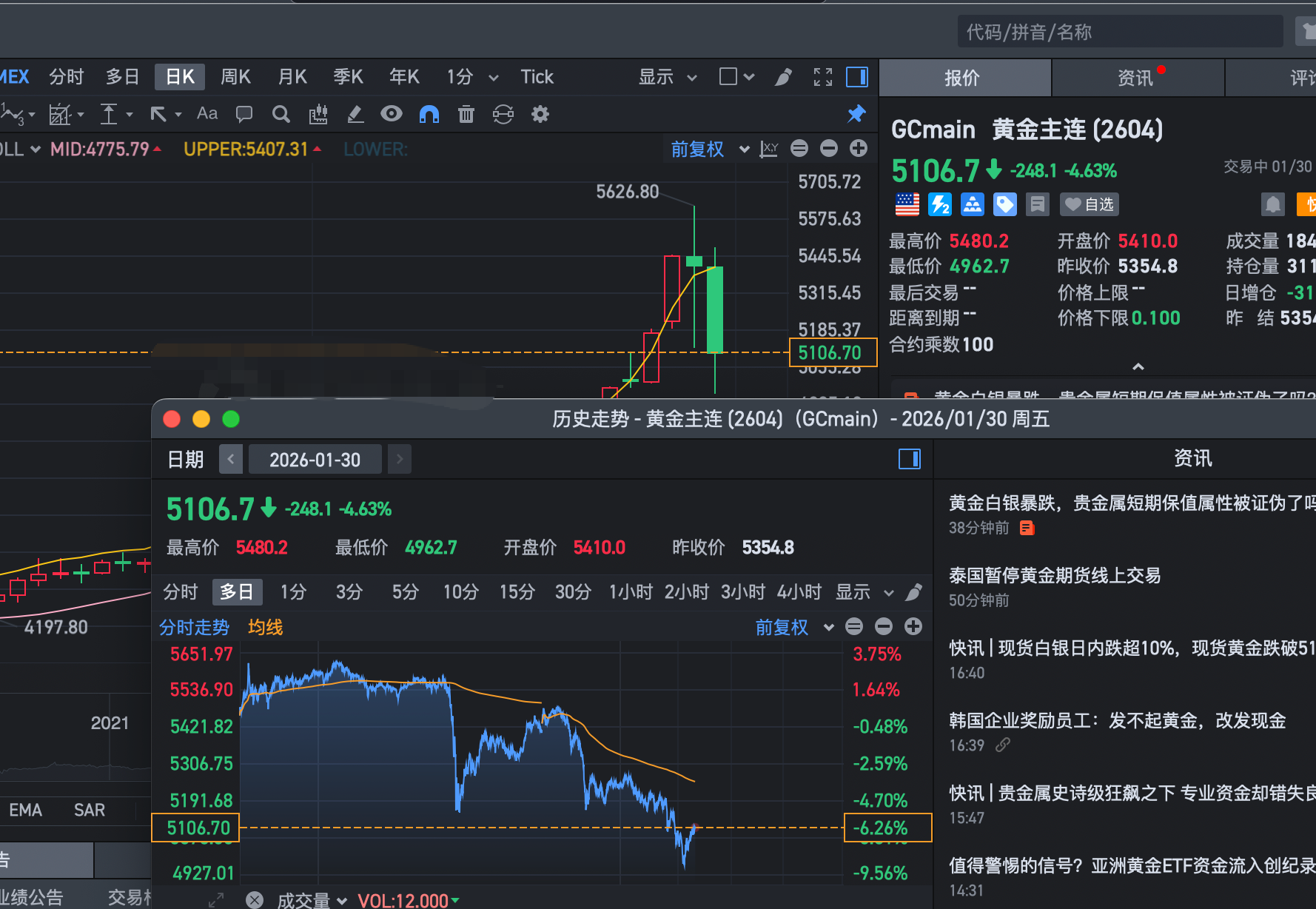 昨天晚上黄金一路上涨,最高涨到了5627美元/盎司的关键点位,随后盘中快速跳水暴跌了8%。今天又是一样,上午好好的反弹,结果欧洲盘一开始,黄金就开始快速跳水,直接又暴跌5%。直接跌破5000美元/盎司。从高位下来直接暴跌了600美元/盎司。