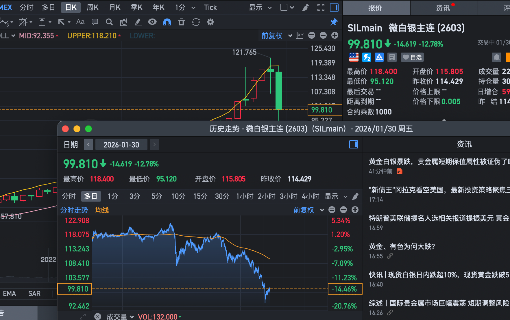 首先是,1月份美联储维持 3.5%-3.75% 利率不变,鲍威尔强调通胀回落慢于预期、不急于降息,3月降息概率从30%骤降至13.5%,本来黄金白银等期货上涨,有很大的一个原因就是市场认为美联储降息,大宗商品涨价推动的,但是现在不降息了,这对黄金白银属于是釜底抽薪。