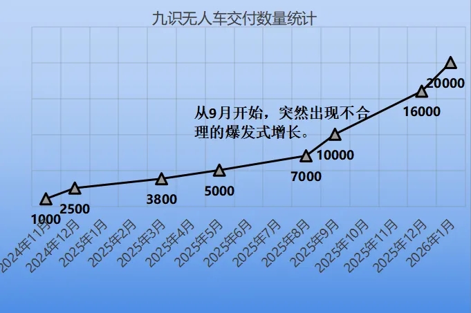 公开信息显示,2025年上半年,九识每个月的交付数量不足1000台,截止到8月,数量一直呈合理的增长趋势。