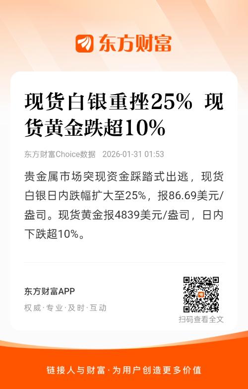 现货白银重挫25% 现货黄金跌超10%东方财富Choice数据3小时前约18秒K图 XAU_0K图 XAG_0贵金属市场突现资金踩踏式出逃,现货白银日内跌幅扩大至25%,报86.69美元/盎司。现货黄金报4839美元/盎司,日内下跌超10%。分享至:微信朋友圈微博郑重声明:东方财富发布此内容旨在传播更多信息,与本站立场无关,不构成投资建议。据此操作,风险自担。
