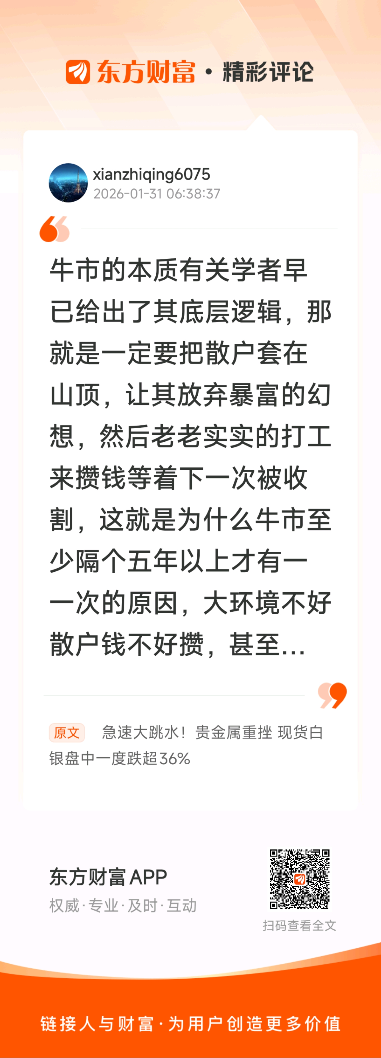//@xianzhiqing6075 :牛市的本质有关学者早已给出了其底层逻辑,那就是一定要把散户套在山顶,让其放弃暴富的幻想,然后老老实实的打工来攒钱等着下一次被收割,这就是为什么牛市至少隔个五年以上才有一一次的原因,大环境不好散户钱不好攒,甚至会隔个十年以上才会有个牛市,就比如这次牛市,但这次大部分人是不赚甚至亏损的,因为这次牛市大部分都是指数和一些热门个股在涨,大部分个股非但没涨有的反而跌幅巨大,所以一般人千万别炒股,最多也就拿个几万块钱中长线玩玩即可,因为A股就是一个却贫济富的市场,大部分普通人都会亏损离场!