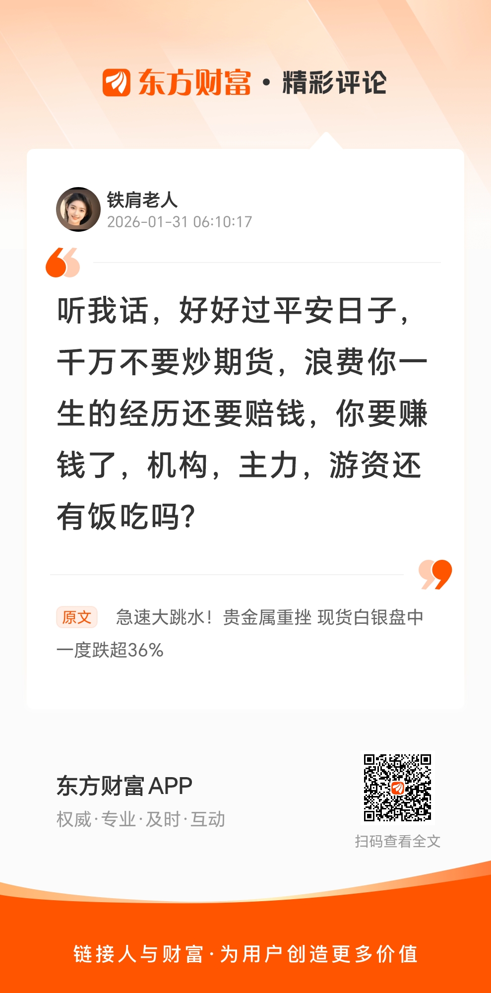 听我话,好好过平安日子,千万不要炒期货,浪费你一生的经历还要赔钱,你要赚钱了,机构,主力,游资还有饭吃吗? 我在《急速大跳水!贵金属重挫 现货白银盘中一度跌超36%》的评论获得了大家的关注。