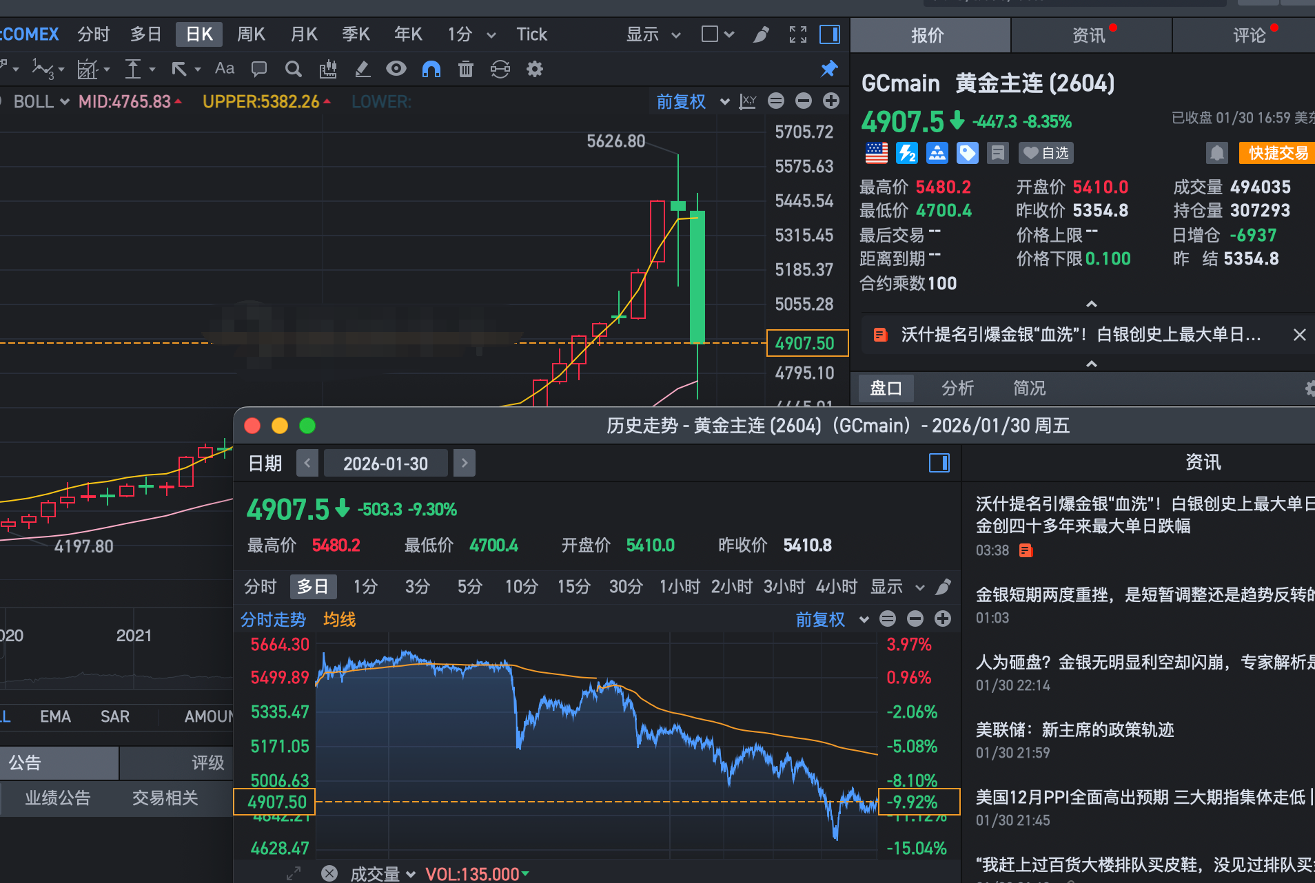 黄金的走势也是非常的惊心动魄,昨天黄金还刚刚突破5600美元/盎司,没想到昨天晚上深夜价格一度跌到4600美元/盎司,一天的时间价格跌了1000美元/盎司,跌幅接近20%,昨天深夜最低也跌到了15%。