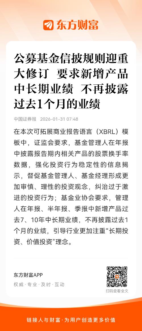 在本次可拓展商业报告语言(XBRL)模板中,证监会要求,基金管理人在年报中披露报告期内相关产品的股票换手率数据,强化投资行为稳定性的信息揭示,督促基金管理人、基金经理形成更加审慎、理性的投资观念,纠治过于激进的投资行为;基金业协会要求,管理人在年报、半年报、季报中新增产品过去7、10年中长期业绩,不再披露过去1个月的业绩,引导行业更加注重“长期投资、价值投资”理念。