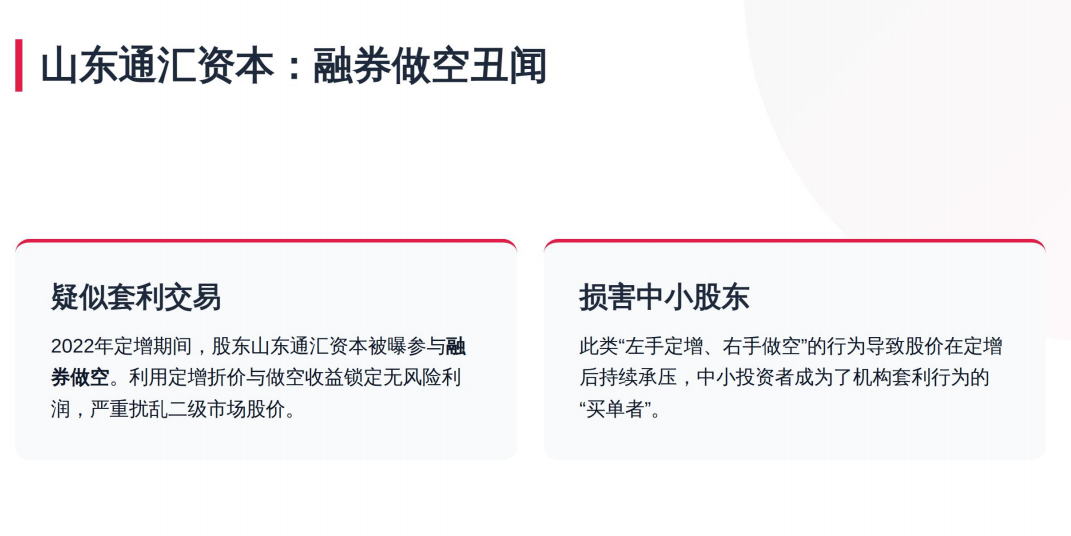 违规质疑:通汇资本在定增期间疑似参与了“融券做空”套利行为,利用券源优势对冲。