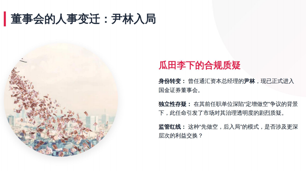 独立性缺失:在通汇资本存在“套利做空”质疑的情况下,其核心人物进入董事会,被质疑是否存在不当的利益输送或私下协议。