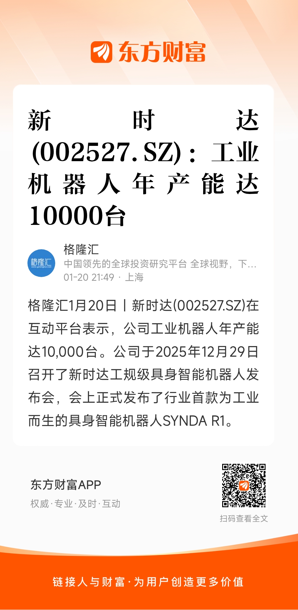格隆汇1月20日丨新时达(002527.SZ)在互动平台表示,公司工业机器人年产能达10,000台。公司于2025年12月29日召开了新时达工规级具身智能机器人发布会,会上正式发布了行业首款为工业而生的具身智能机器人SYNDA R1。