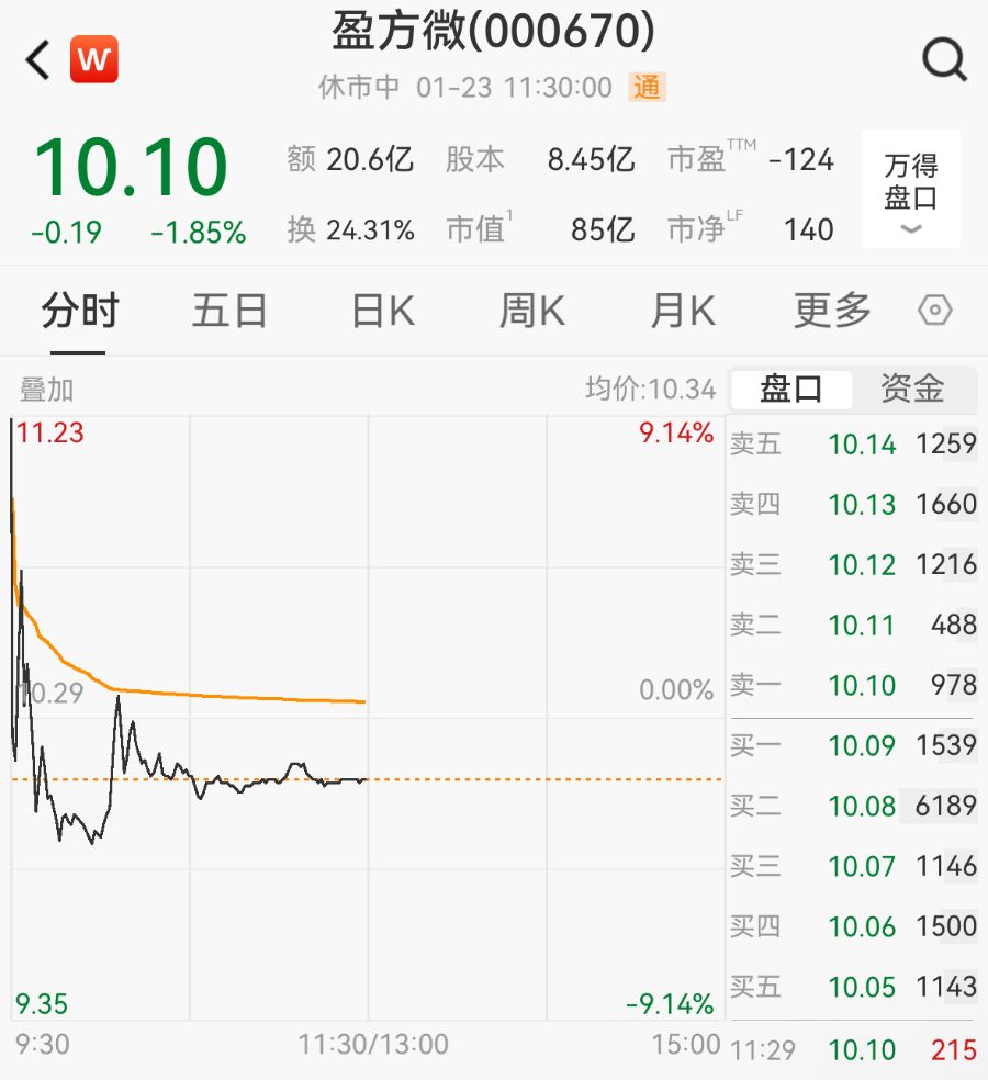 1月23日,盈方微(000670.SZ)股价高台跳水,结束此前的三连板行情,截至午间收盘,跌1.85%,报10.10元/股。