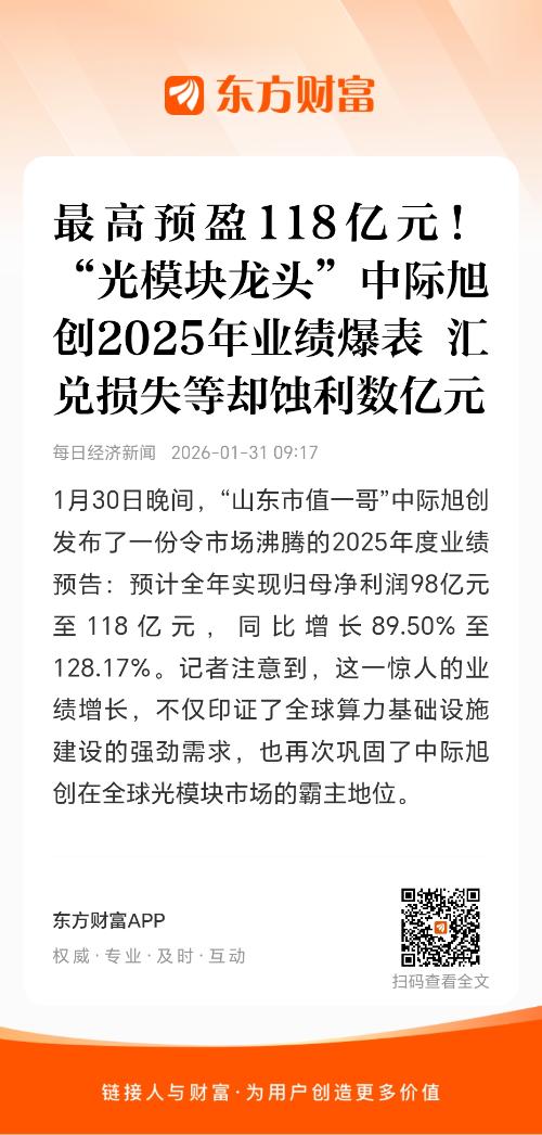 1月30日晚间,“山东市值一哥”中际旭创发布了一份令市场沸腾的2025年度业绩预告:预计全年实现归母净利润98亿元至118亿元,同比增长89.50%至128.17%。