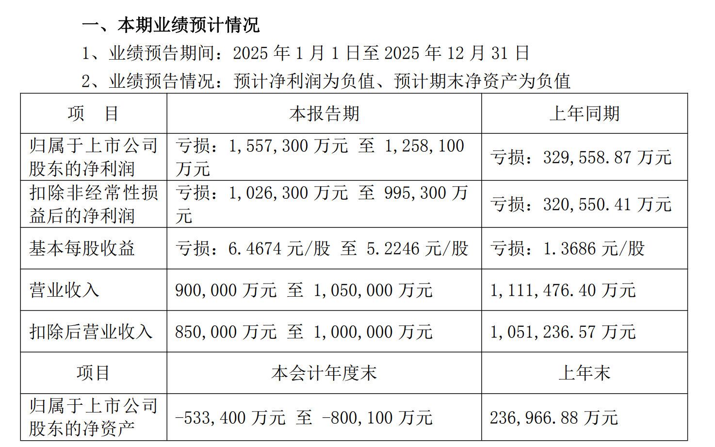 2025年年报预告亏损金额10亿左的公司名单: