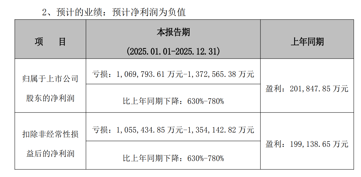 2025年年报预告亏损金额80亿以上的公司名单: