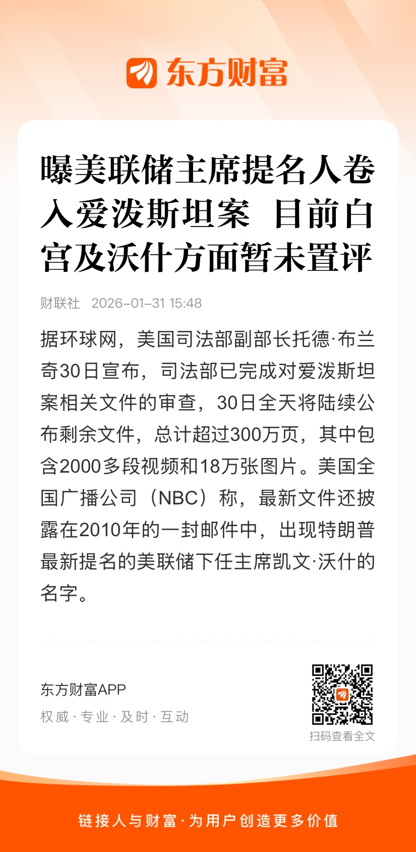 据环球网,美国司法部副部长托德·布兰奇30日宣布,司法部已完成对爱泼斯坦案相关文件的审查,30日全天将陆续公布剩余文件,总计超过300万页,其中包含2000多段视频和18万张图片。美国全国广播公司(NBC)称,最新文件还披露在2010年的一封邮件中,出现特朗普最新提名的美联储下任主席凯文·沃什的名字。报道称,沃什的名字被列在“2010年圣巴特岛圣诞”活动的邮件宾客名单中,目前白宫及沃什方面暂未置评。