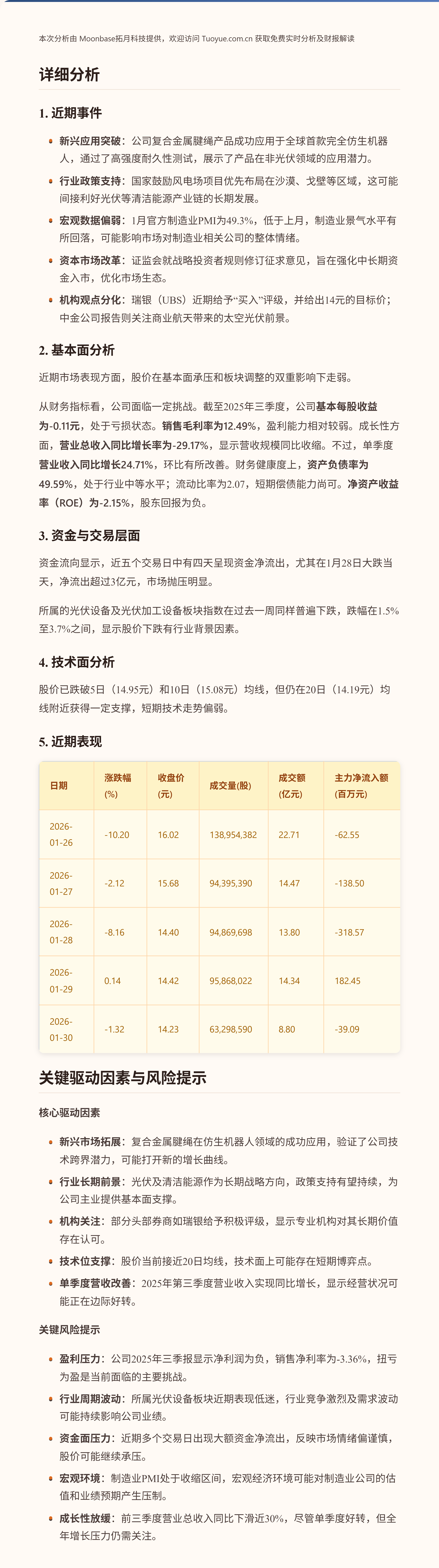 高测股份近期股价出现显著回调,过去五个交易日累计下跌超过20%。股价下跌主要受到光伏设备板块整体表现疲软以及公司自身财务数据的影响,例如2025年三季度报告显示公司仍处于亏损状态。值得关注的是,公司产品在仿生机器人等新兴领域获得应用突破,这可能为未来增长提供新的想象空间。