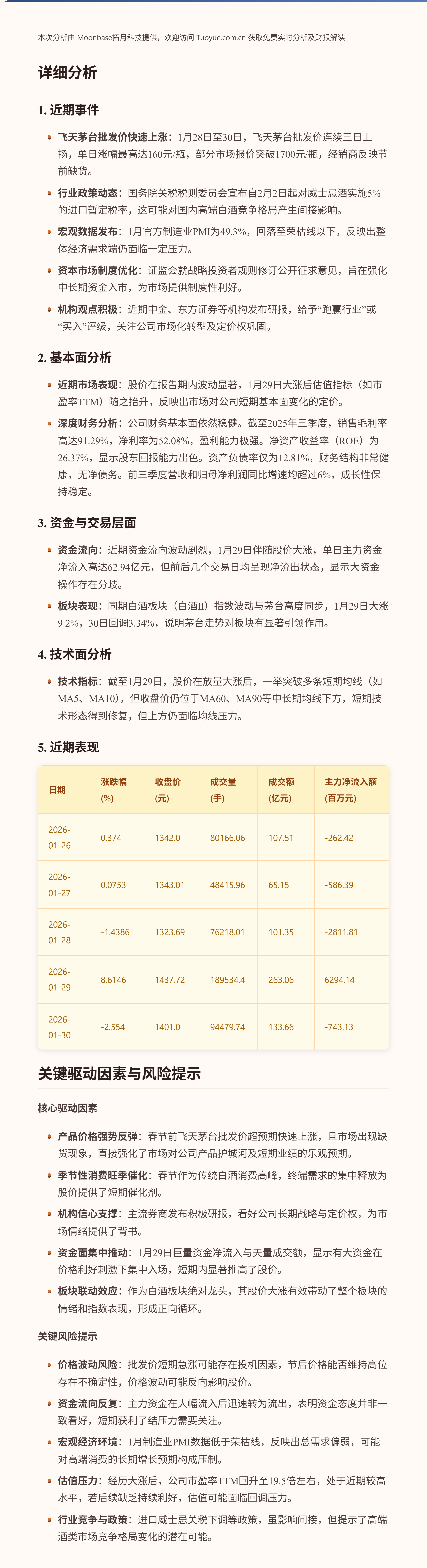 近期贵州茅台股价在1月29日出现单日超过8.6%的大幅上涨,主要驱动因素是春节前飞天茅台批发价格快速反弹,市场供需关系趋紧。关键亮点在于产品价格信号对市场情绪的强力提振,但随后一日股价有所回调,显示市场在快速反应后趋于理性。