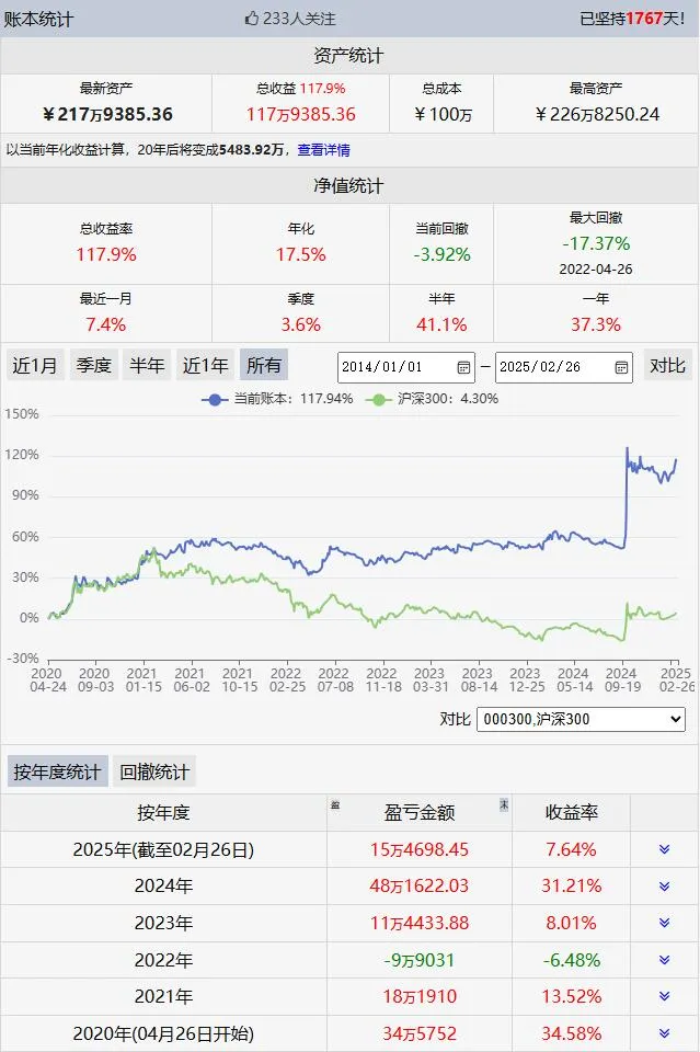自2020年4月27日公开操作以来总收益117.93%,同期沪深300上涨4.3%,中证500上涨14.76%,创业板上涨13.2%,科创50下跌1.51%。