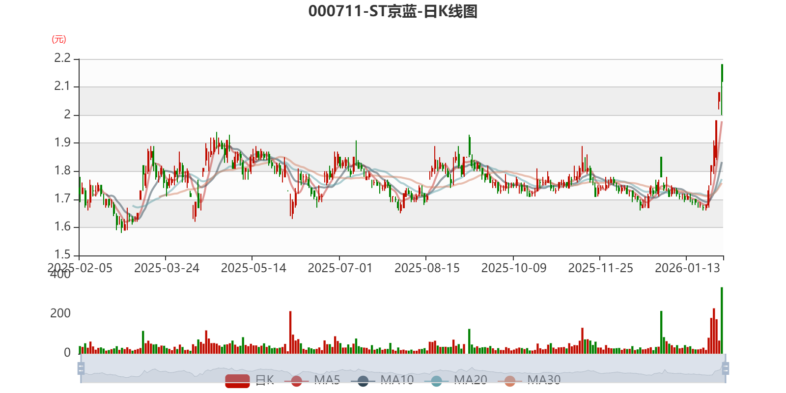 中证智能财讯 ST京蓝(000711)1月30日晚间披露2025年度业绩预告,预计2025年实现营业收入4.4亿元至5.1亿元;归母净利润亏损1.6亿元至2.3亿元,上年同期亏损1.1亿元;扣非净利润亏损1.5亿元至2.2亿元,上年同期亏损1.19亿元;基本每股收益-0.05元/股至-0.08元/股。以最新收盘价计算,市净率(LF)约10.45倍,市销率(TTM)约12.75倍。