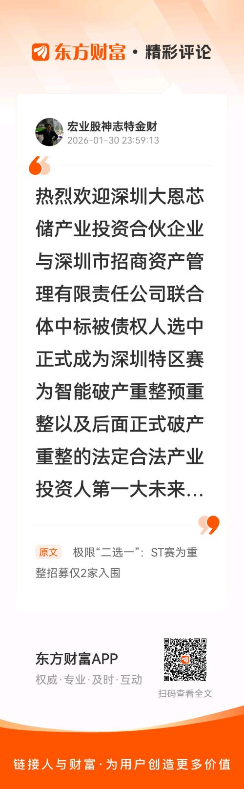 围绕“18天极限招募”的公平性质疑、管理人独立性争议仍未平息。1月29日晚间,ST赛为(300044.SZ)破产重整迎来进展,披露此前引发市场广泛争议的重整投资人招募进度。