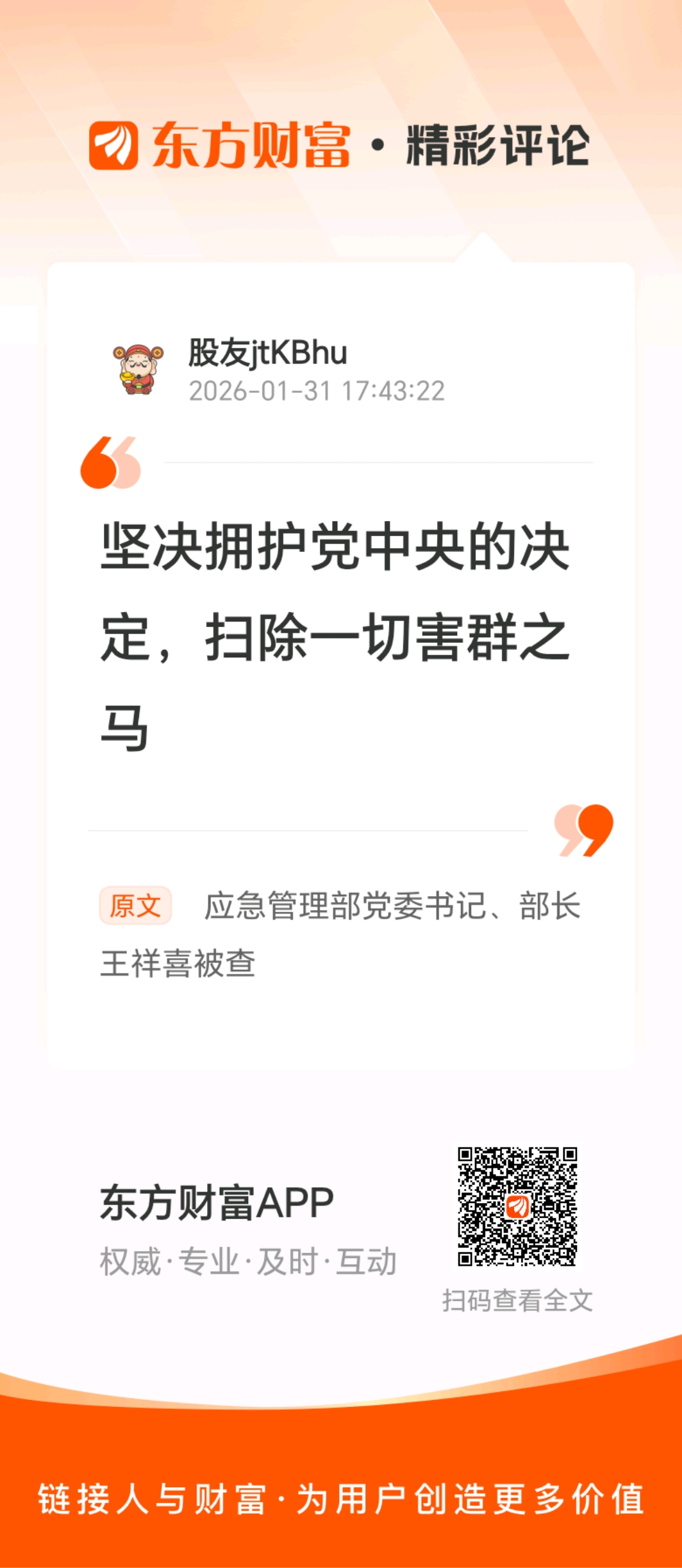 温馨提示: 1.根据《证券法》规定,禁止编造、传播虚假信息或者误导性信息,扰乱证券市场;2.用户在本社区发表的所有资料、言论等仅代表个人观点,与本网站立场无关,不对您构成任何投资建议。用户应基于自己的独立判断,自行决定证券投资并承担相应风险。《东方财富社区管理规定》