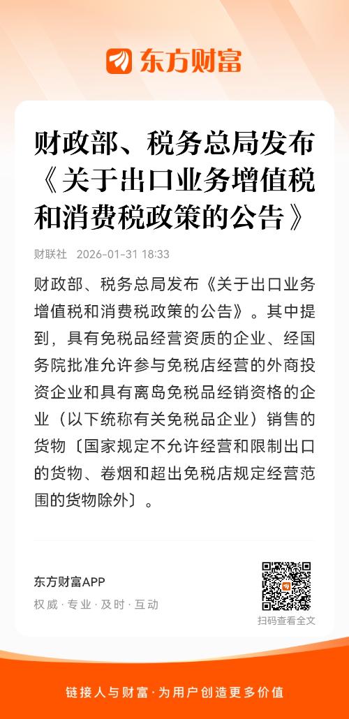 财政部、税务总局发布《关于出口业务增值税和消费税政策的公告》。其中提到,具有免税品经营资质的企业、经国务院批准允许参与免税店经营的外商投资企业和具有离岛免税品经销资格的企业(以下统称有关免税品企业)销售的货物〔国家规定不允许经营和限制出口的货物、卷烟和超出免税店规定经营范围的货物除外〕。具体是指,有关免税品企业统一采购进入其所属口岸出境免税店、市内免税店、离岛免税店销售的符合规定的货物。
