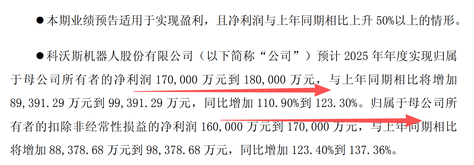 科沃斯,2025年净利润增长111%到123%。净利润达到17亿到18亿元。