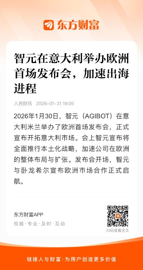 2026年1月30日,智元(AGIBOT)在意大利米兰举办了欧洲首场发布会,正式宣布开拓意大利市场。会上智元宣布将全面推行本土化战略,加速公司在欧洲的整体布局与扩张。发布会开场,智元与卧龙希尔宣布欧洲市场合作正式启航。为确保在意大利的本土化部署与运营可靠性,智元宣布与意大利领先的工业系统集成商SIR Spa达成战略合作。SIR将提供系统集成、现场部署及运营支持,确保人形机器人解决方案深度适配本地工业与服务环境。