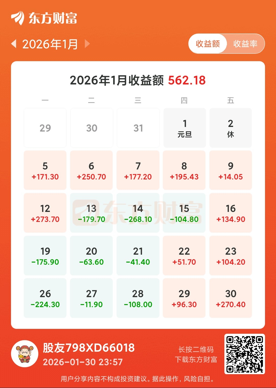 今天是最后一天,本月盈利562.18元,至今亏损1984.06元本金1万不变