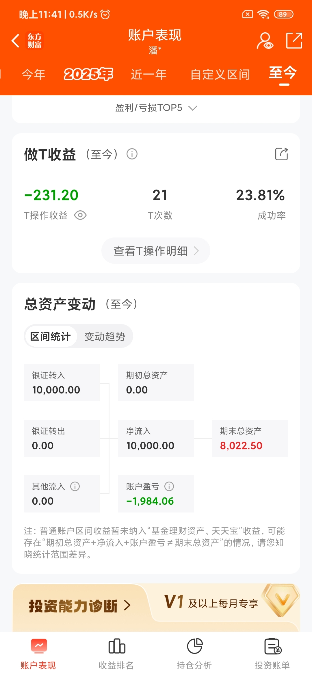 今天是最后一天,本月盈利562.18元,至今亏损1984.06元 本金1万不变