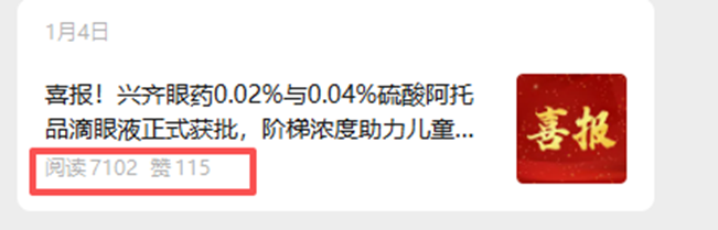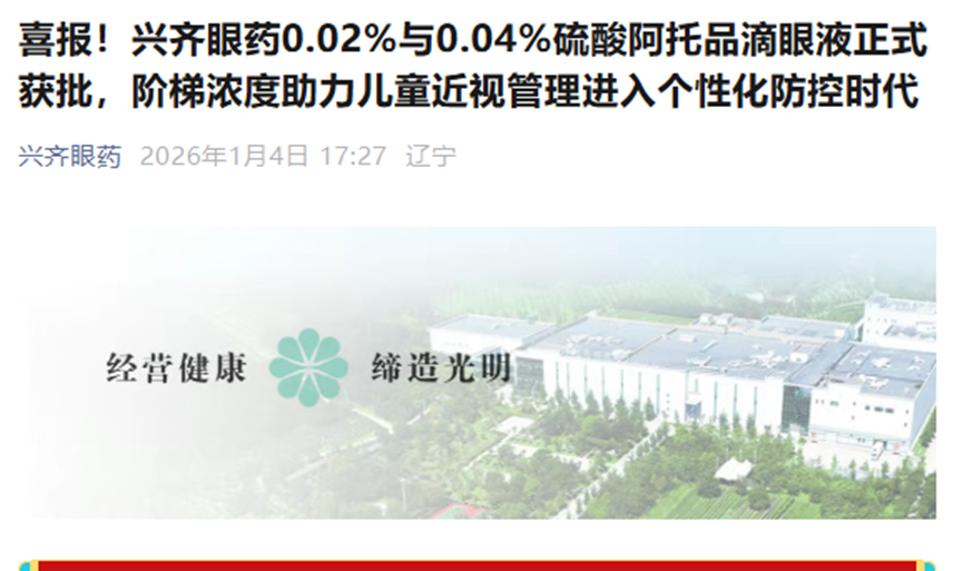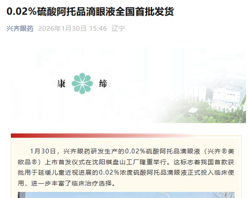 周五盘后,兴齐公司公众号发布了一条“0.02%硫酸阿托品滴眼液全国首批发货