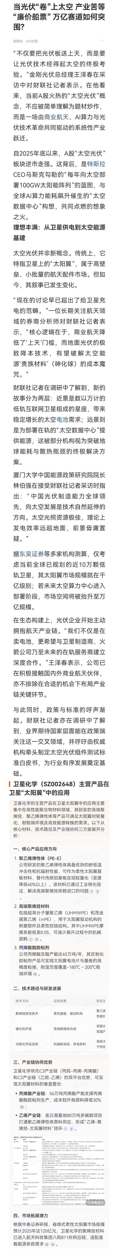 “不仅要把光伏板送上天,而是要让光伏技术经得起太空的终极考验。”金刚光伏总经理王泽春在采访中对财联社记者表示。在他看来,当前A股火热的“太空光伏”概念,不应被简单理解为题材炒作,而是一场由商业航天、AI算力与光伏技术革命共同驱动的系统性产业跃迁。