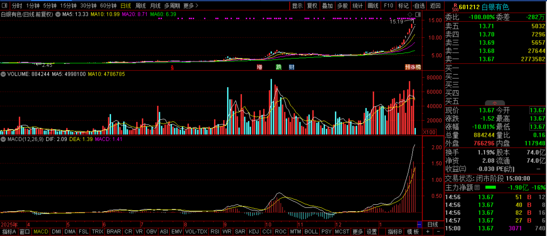 $白银有色(SH601212)$白银有色(SZ601212):黄金+白银+锂电材料+铜铅锌+甘肃国企。今日该股受隔夜金银等有色大宗商品大幅下跌以及本身短期上涨过快异动影响,地板开盘,这是猪力的主动性超调,其实昨日已有继续,笔者也在评论说过,短期要防范风险,不过这种调整就仅仅是调整而已,如果接下来能够连续3天以上的超调,那后市调整可能就会结束,而金银未来继续新高依旧是大概率,所以真这样的话,机遇就来了。这个时候一定要耐心等待。