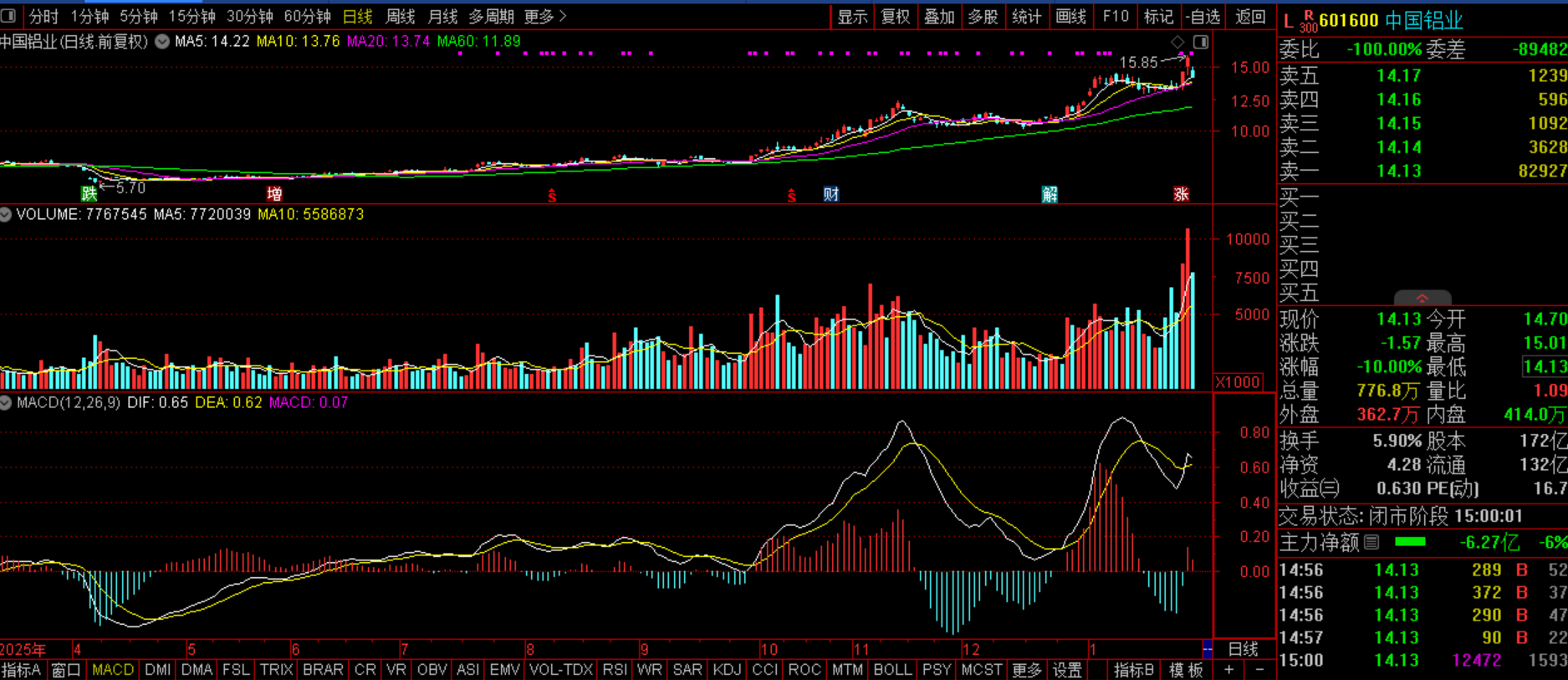 $中国铝业(SH601600)$中国铝业(SZ601600):工业金属+稀土参股+央企+电解铝龙头+业绩增长。今日此股受隔夜铝等大宗商品强势下跌影响,大幅低开并最终地板,量能略有萎缩,这是正常的调整,是良性分歧,而该股的上涨预期依旧,所以对于后市笔者依旧坚定看涨,如果明日继续强势调整的话,机遇大于风险,还是值得研究尝试的,具体下周一再看。