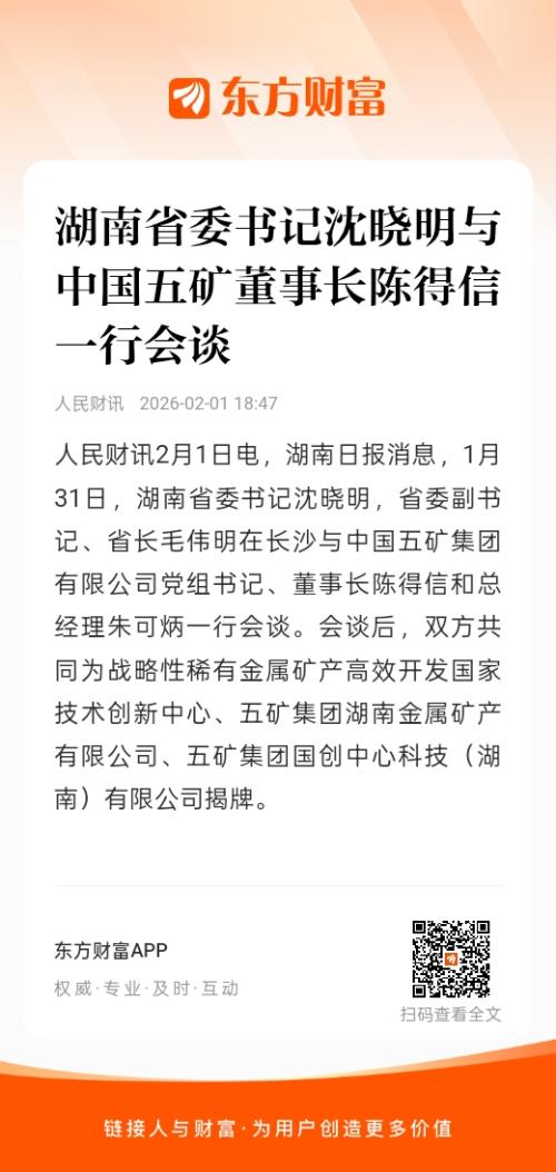 人民财讯2月1日电,湖南日报消息,1月31日,湖南省委书记沈晓明,省委副书记、省长毛伟明在长沙与中国五矿集团有限公司党组书记、董事长陈得信和总经理朱可炳一行会谈。会谈后,双方共同为战略性稀有金属矿产高效开发国家技术创新中心、五矿集团湖南金属矿产有限公司、五矿集团国创中心科技(湖南)有限公司揭牌。